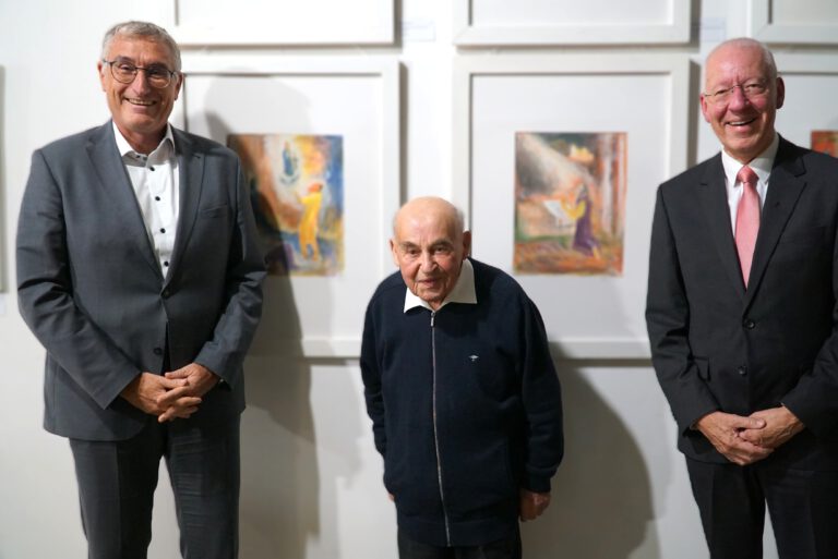 Nikolaus Stark ist ein fleißiger Künstler. Sein Atelier ist voll von Werken, die er im Laufe seines Lebens bereits erstellt hat. Der 94-Jährige ist selbst anwesend bei der Vernissage im Foyer des Landratsamtes. Er erzählt auch gerne von seinen Geschichten, die er als Künstler in Szene setzt. Und als Theologe steckt in allem auch sein Glaube – egal, ob er von Salomons geteiltem Herzen, von Ezechiels Visionen, von der Landschaft um Schloss Baldern oder einem Strauß Akeleien berichtet.